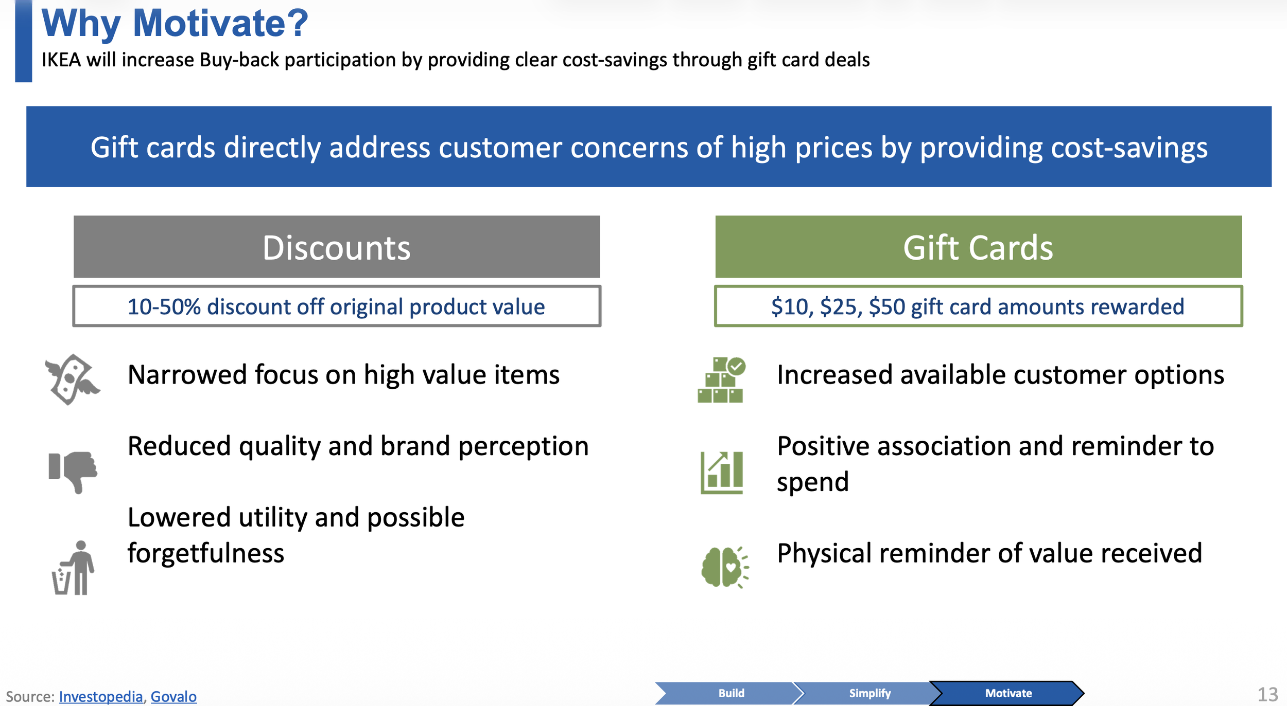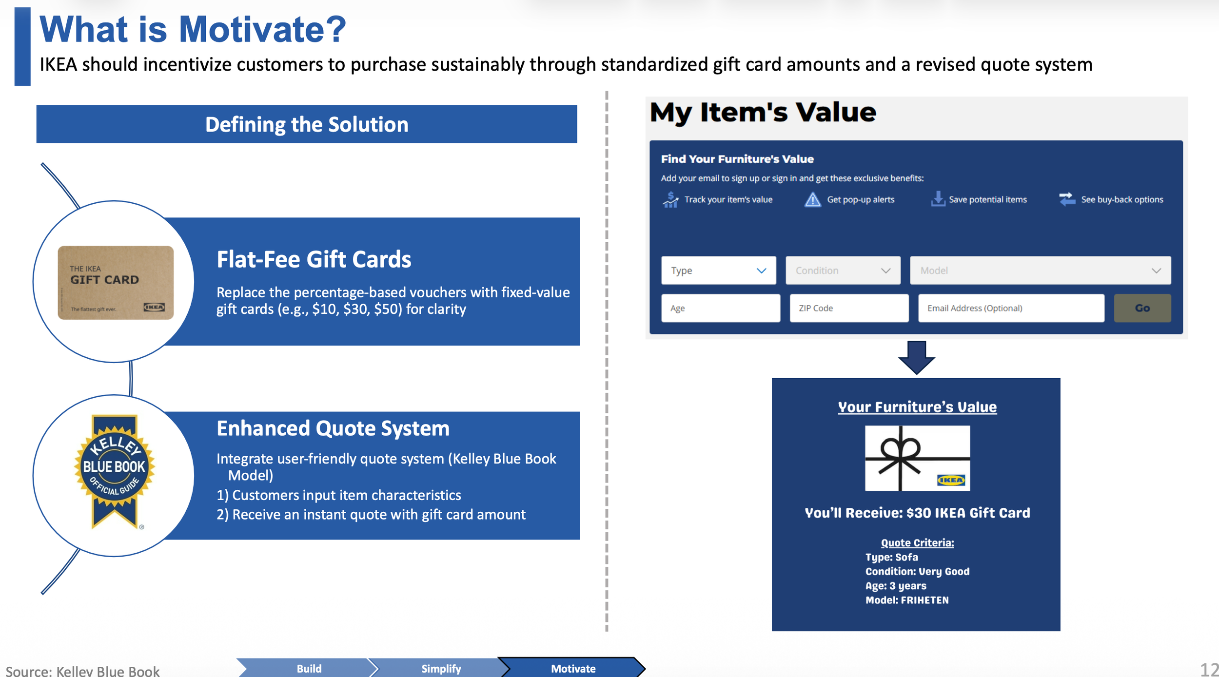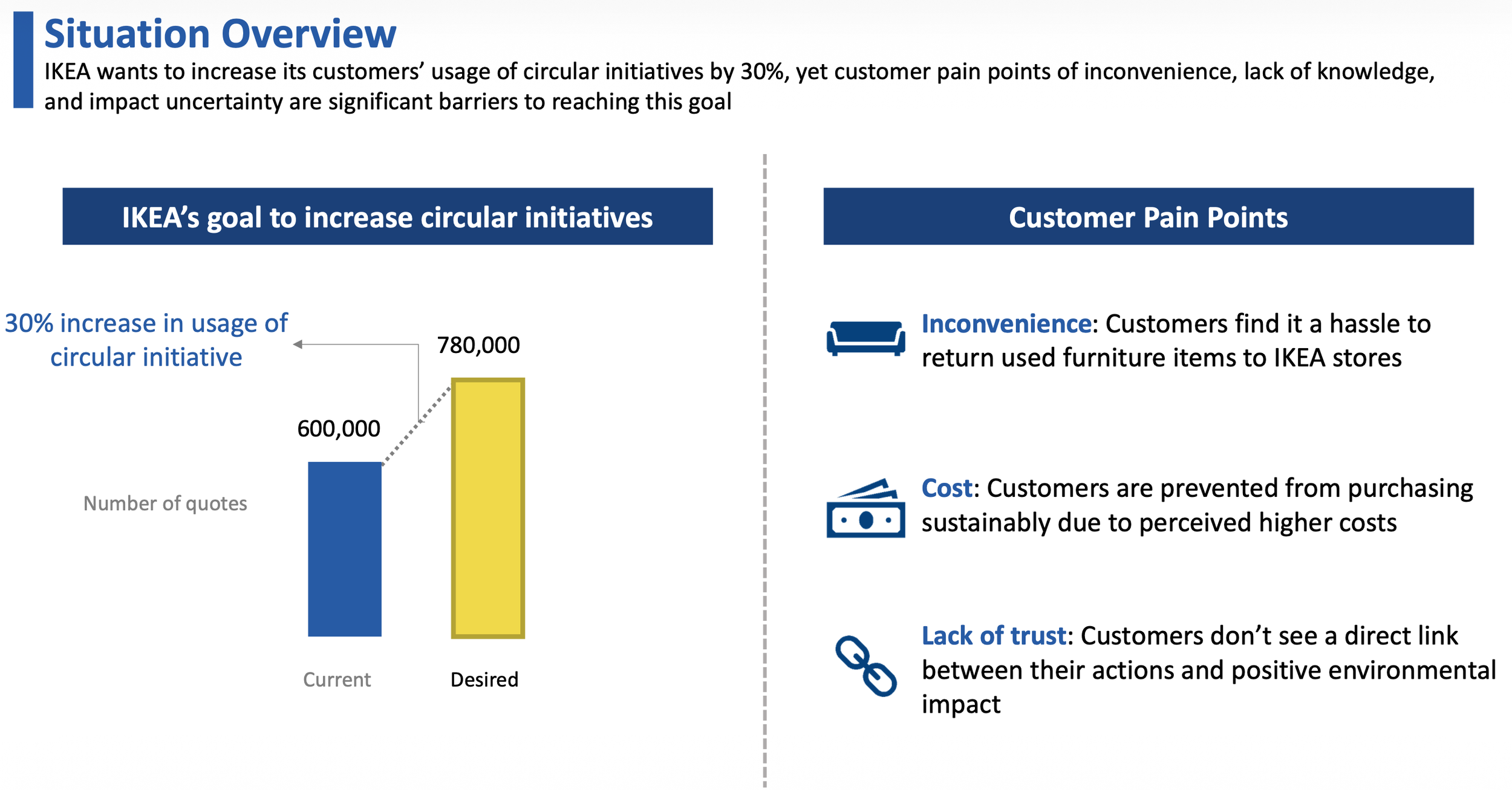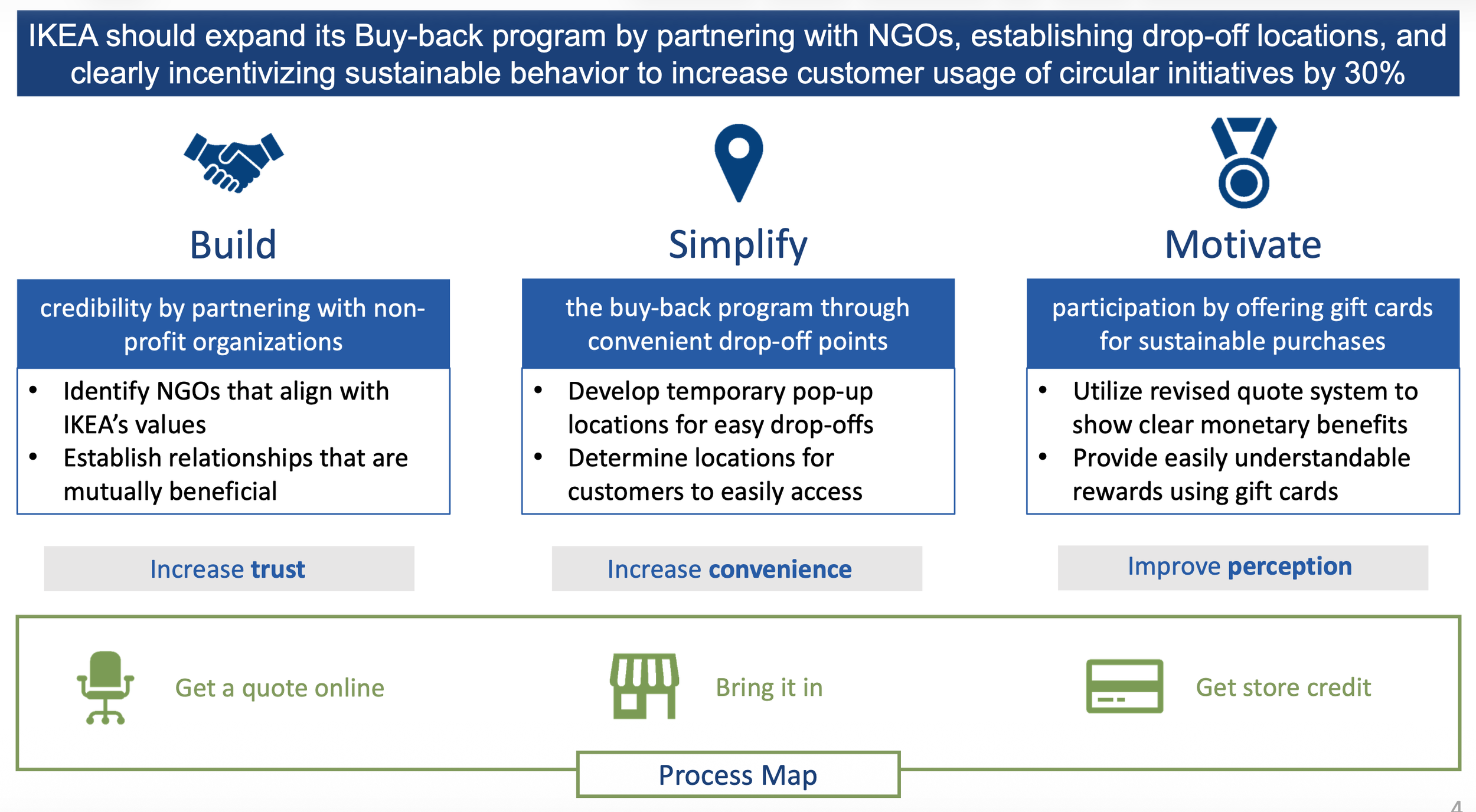As part of a four-person consulting team, I analyzed IKEA’s existing circular initiatives and developed a strategic recommendation to help the brand increase customer participation in sustainable behaviors by 30%. Our final proposal centered on expanding and strengthening IKEA’s Buy-back Program, which directly addresses customer pain points around trust, convenience, and perceived cost barriers.