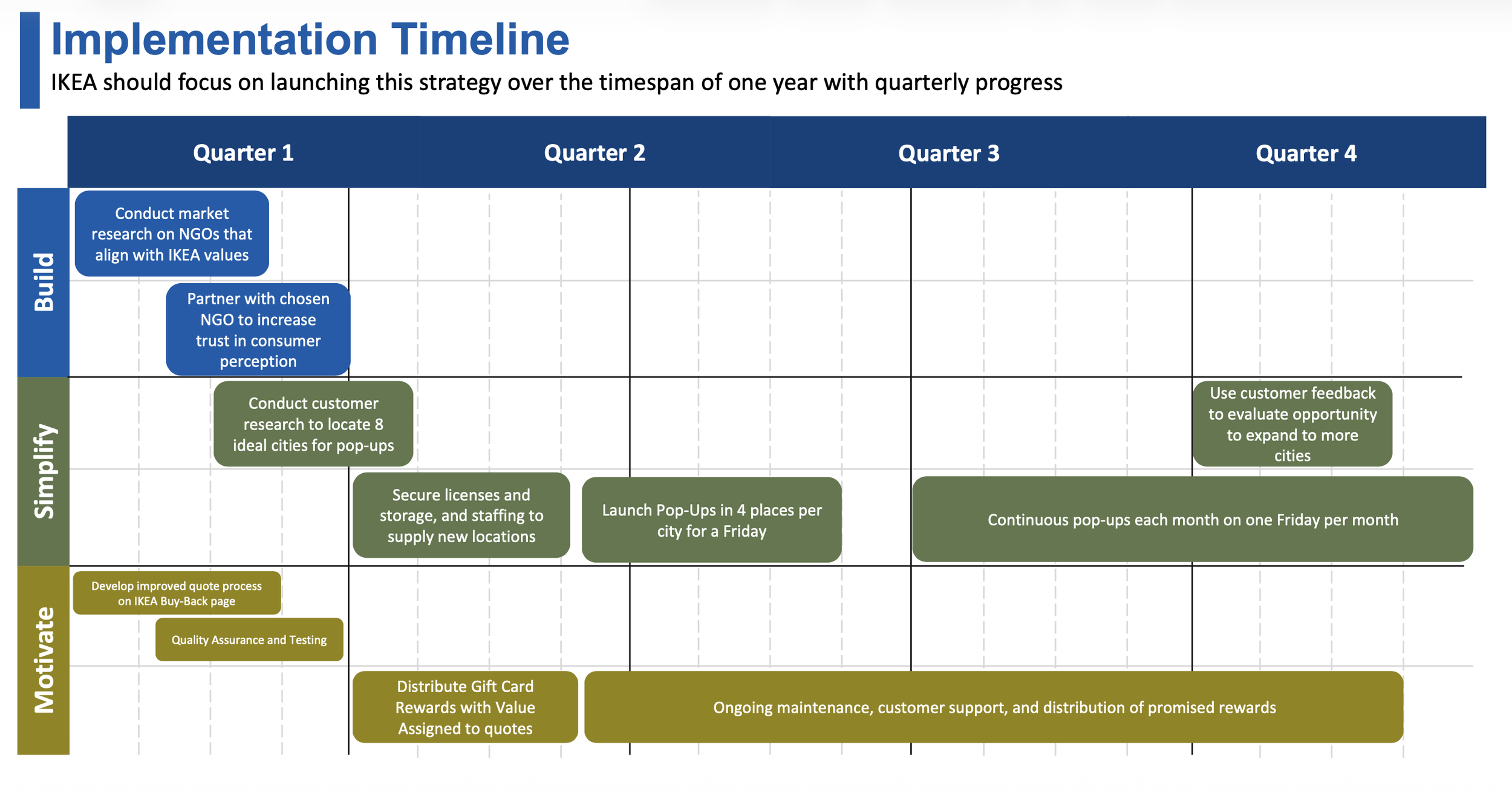 We recommended that IKEA partner with credible NGOs (e.g., Habitat for Humanity, Goodwill, Greenpeace) to: