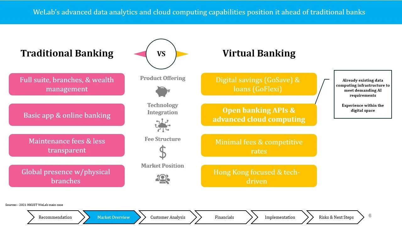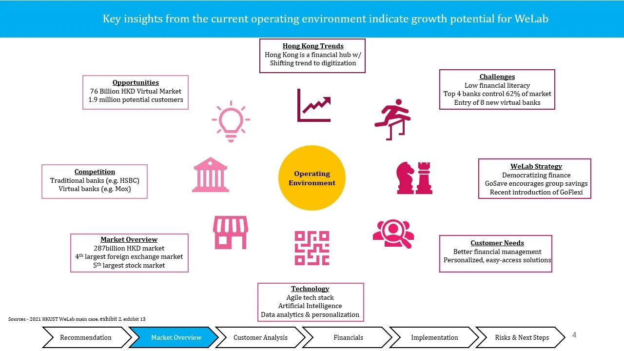 Assessed Hong Kong as a financial hub with strong digitization trends but low financial literacy and concentrated market share among four major banks.