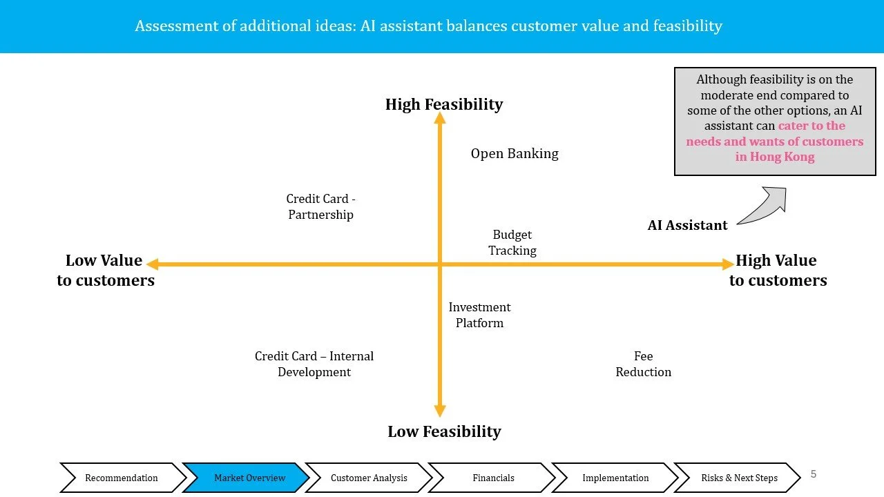 Helped prioritize strategic options (fee reduction, budget tracking, open banking, AI assistant) using a value versus feasibility framework.